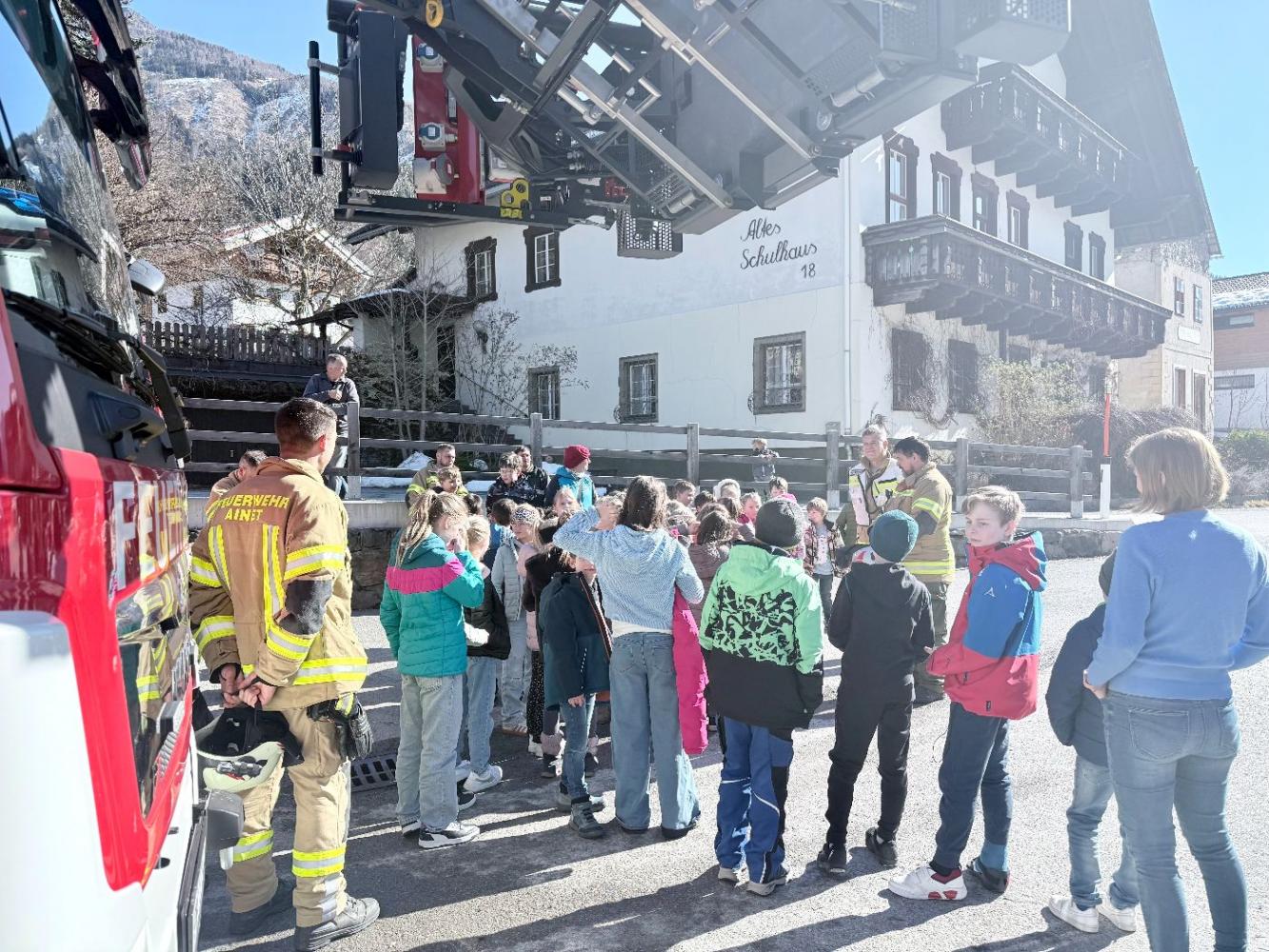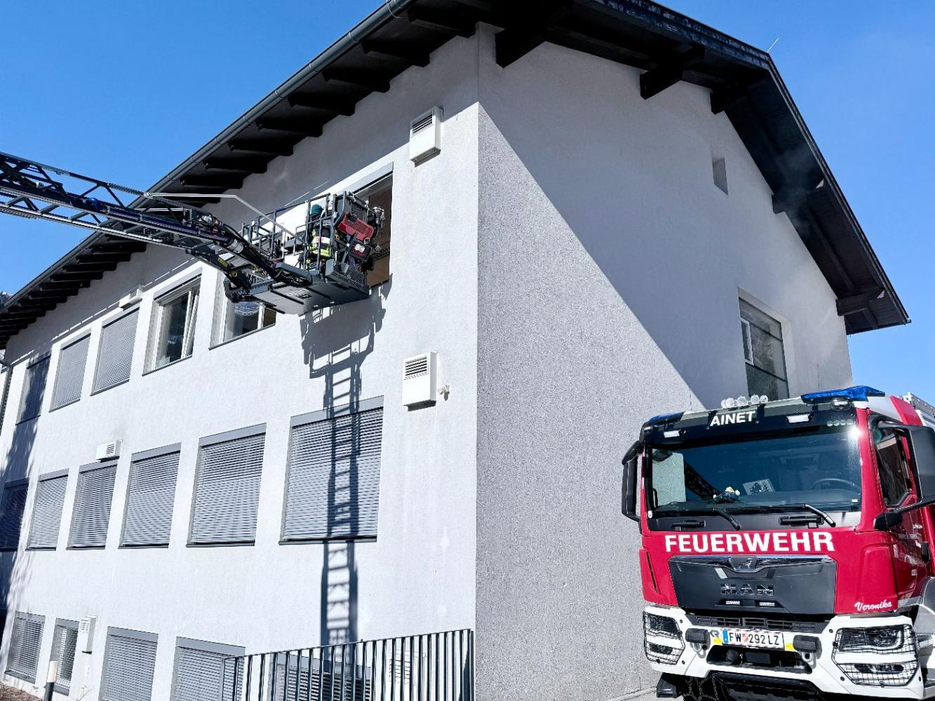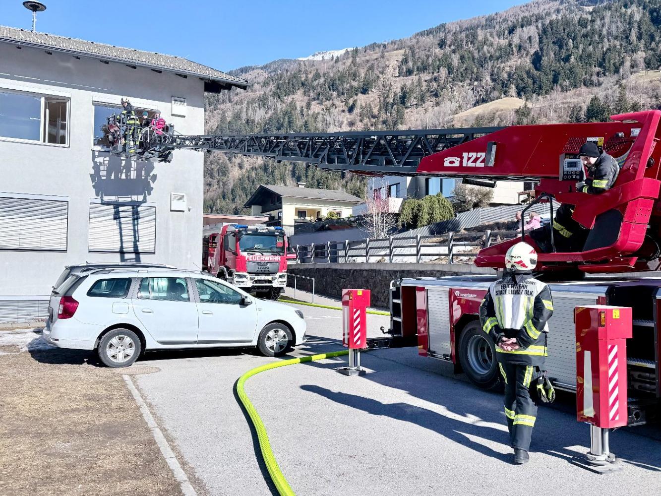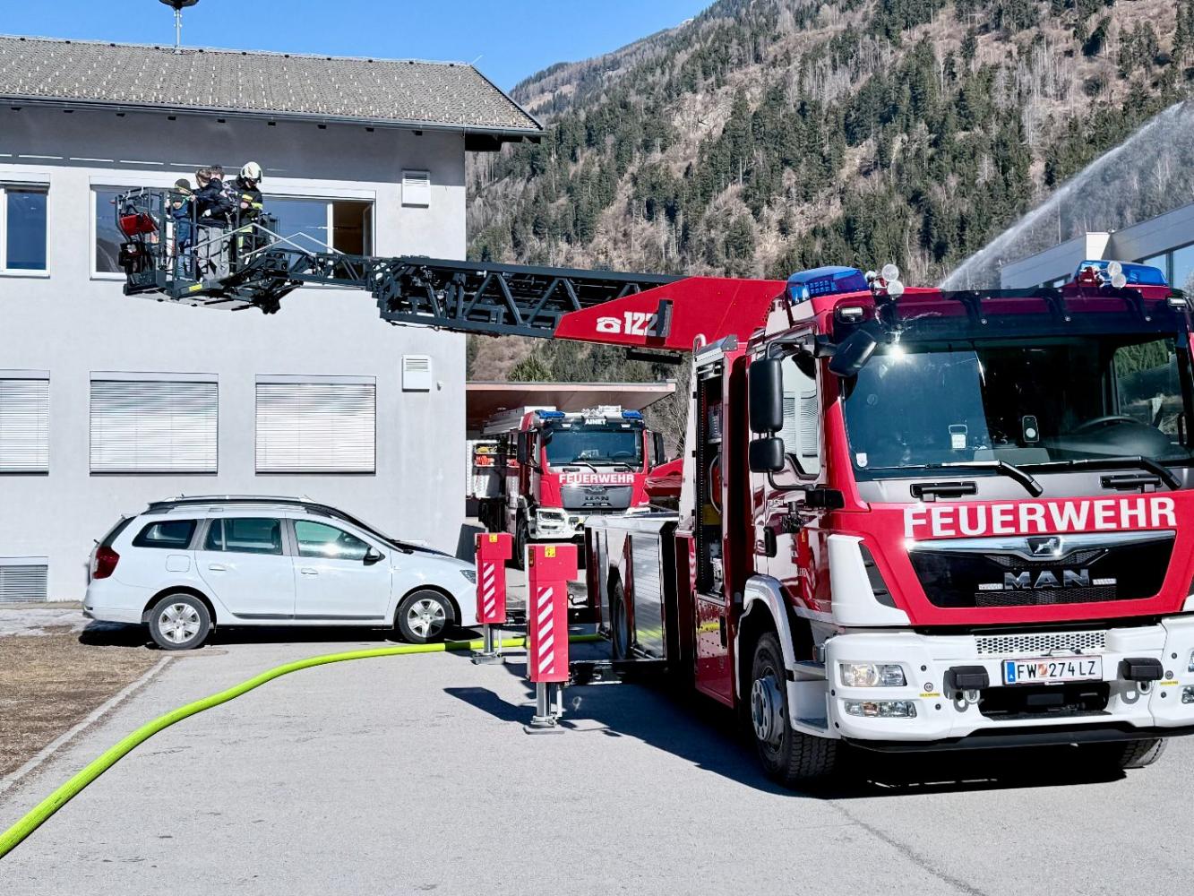 Gemeinsam mit der Freiwilligen Feuerwehr Ainet und der Freiwilligen Feuerwehr der Stadt Lienz – die sogar mit der Drehleiter anrückte – wurde der Ernstfall geprobt.